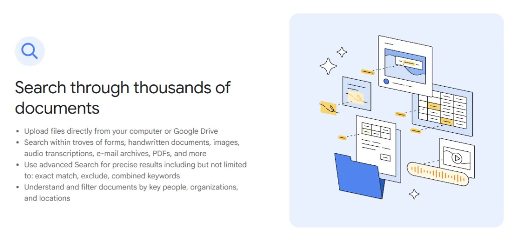 Pinpoint es una herramienta basada en la nube que permite a los periodistas cargar, buscar y analizar grandes cantidades de documentos, audios y vídeos. Utiliza el poder de la IA para transcribir automáticamente archivos de audio y vídeo, lo que facilita la búsqueda de información específica dentro de estos formatos. Además, Pinpoint puede identificar automáticamente nombres, ubicaciones, organizaciones y otros datos clave dentro de los documentos, lo que ayuda a los periodistas a descubrir conexiones y patrones ocultos.